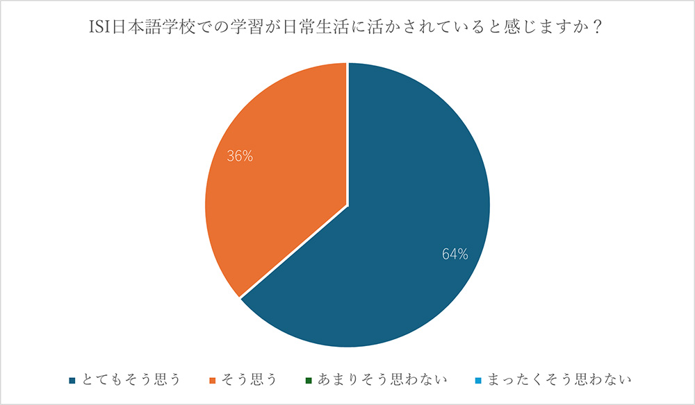 今回の調査では、ISI日本語学校での学習について、回答者の63.6%が「大変役立った」、36.4%が「役立った」と回答し、全員が「日本語学習が日常生活において有用である」と実感していることが明らかになりました。